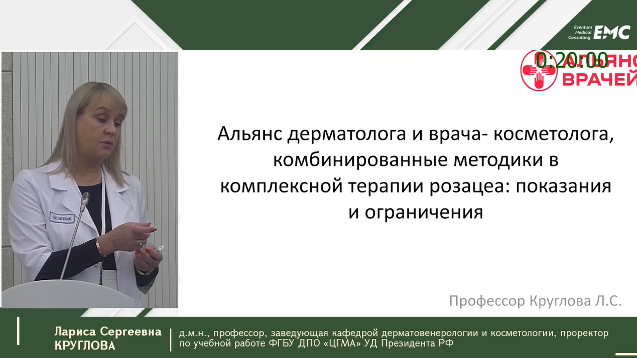 Лариса Сергеевна Круглова, д.м.н., профессор, заведующая кафедрой дерматовенерологии и косметологии, проректор по учебной работе ФГБУ ДПО «ЦГМА» УД Президента РФ - Особенности ведения косметологических пациентов с гиперчувствительной кожей.