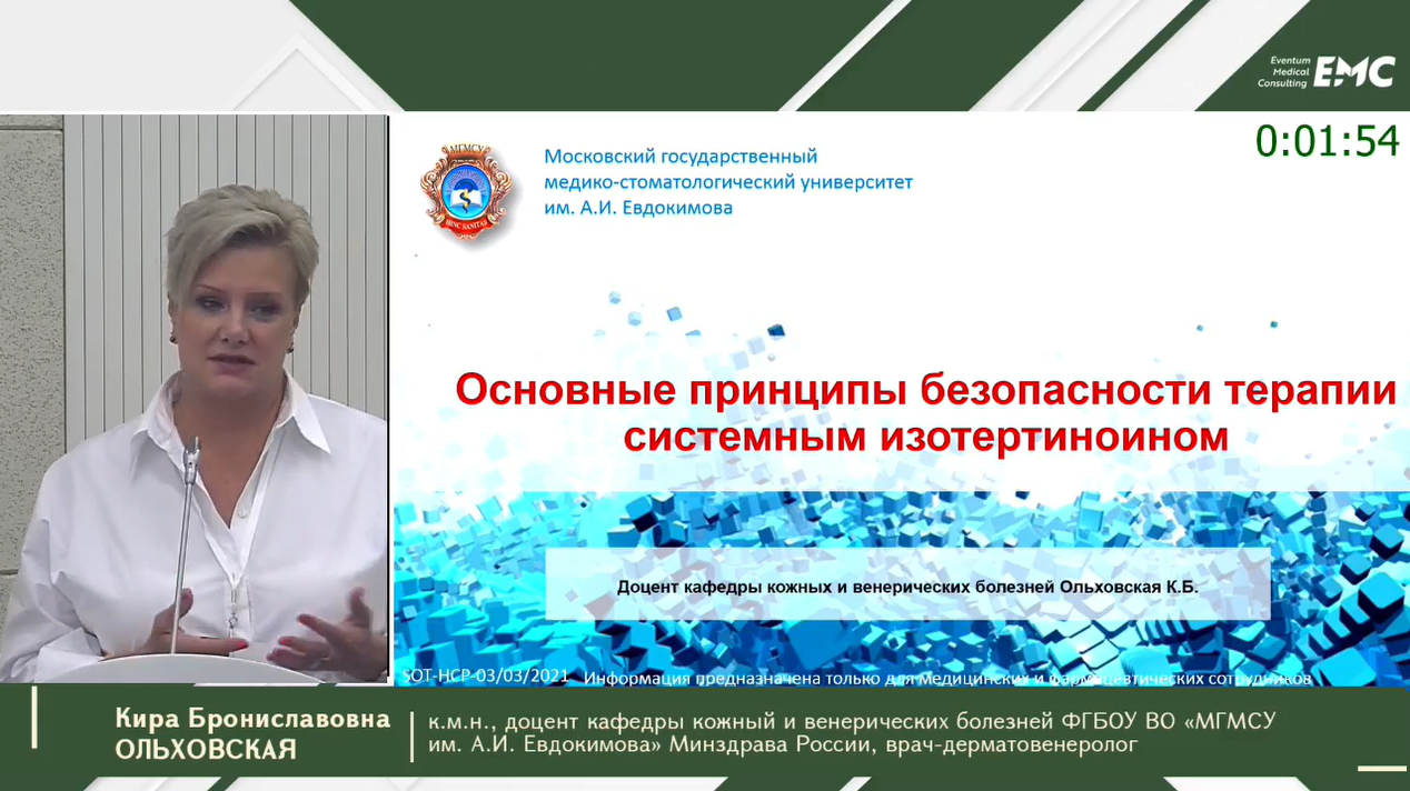 Кира Брониславовна Ольховская, к.м.н., доцент кафедры кожный и венерических болезней ФГБОУ ВО «МГМСУ им. А.И.Евдокимова» Минздрава России, врач дерматовенеролог - Акне взрослых и коморбидная патология.