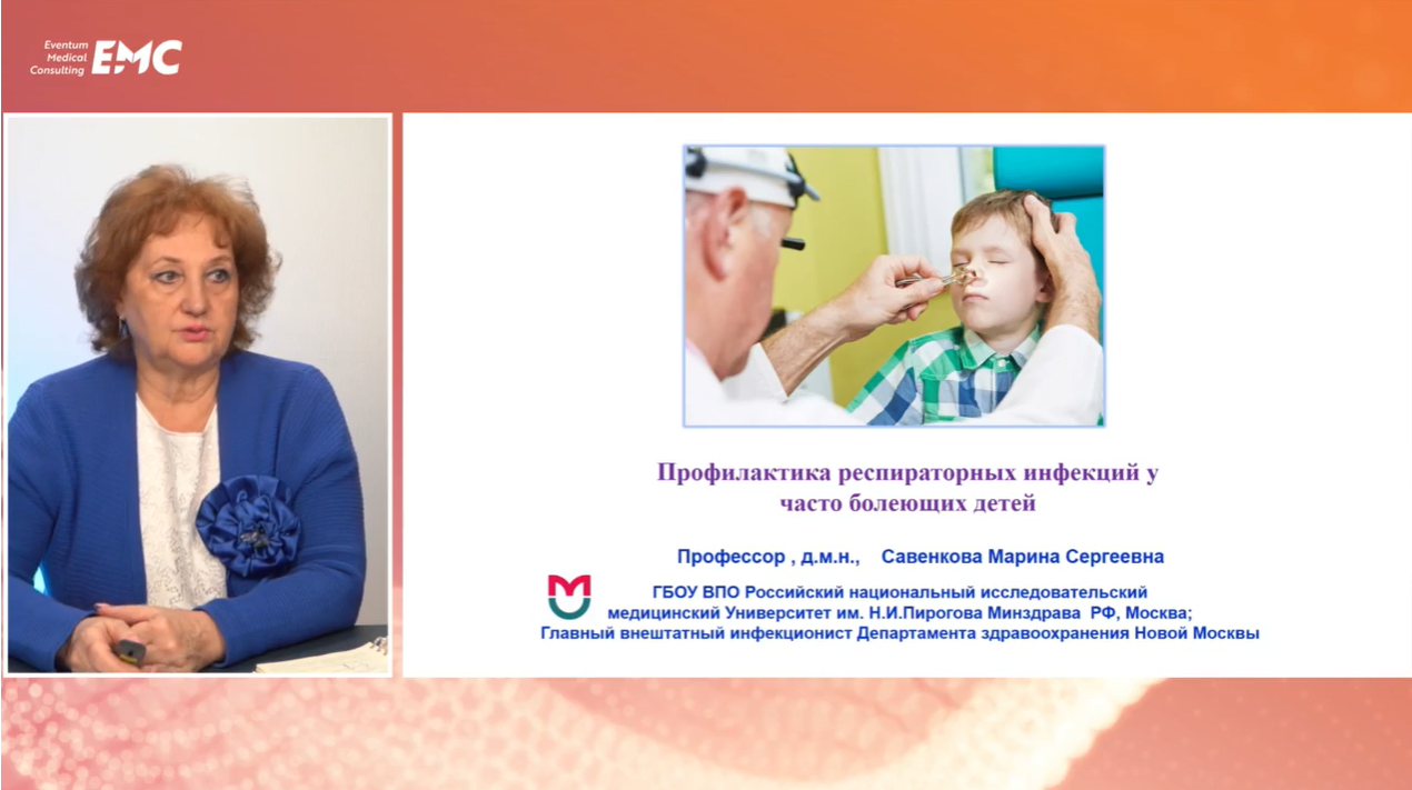 Марина Сергеевна Савенкова, доктор медицинских наук, профессор, заведующий педиатрическим отделом кафедры клинической функциональной диагностики ФГАОУ ВО «РНИМУ им. Н.И. Пирогова» Минздрава России - Профилактика респираторных инфекций у часто болеющих детей.