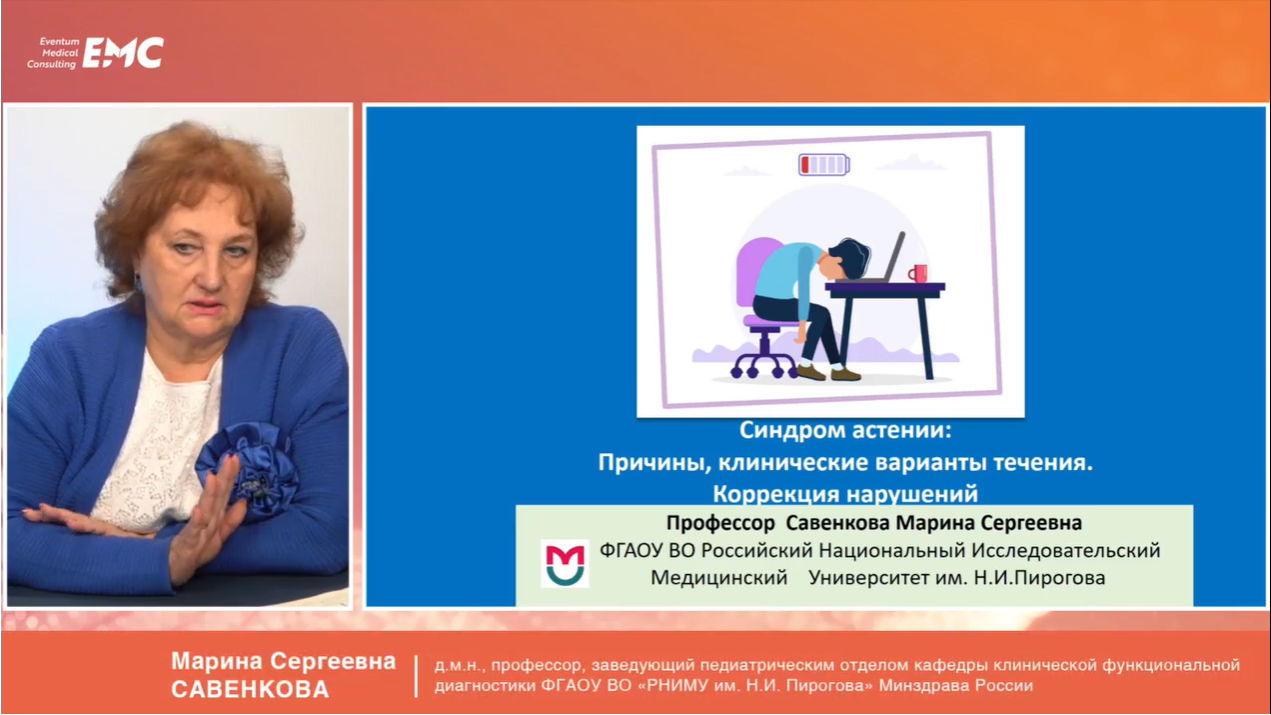 Марина Сергеевна Савенкова, доктор медицинских наук, профессор, заведующий педиатрическим отделом кафедры клинической функциональной диагностики ФГАОУ ВО «РНИМУ им. Н.И. Пирогова» Минздрава России - Синдром астении: причины, клинические варианты течения, коррекция нарушений.